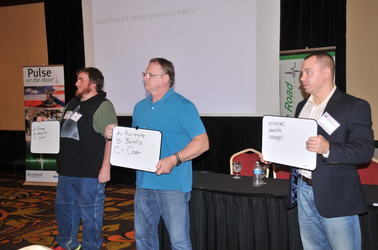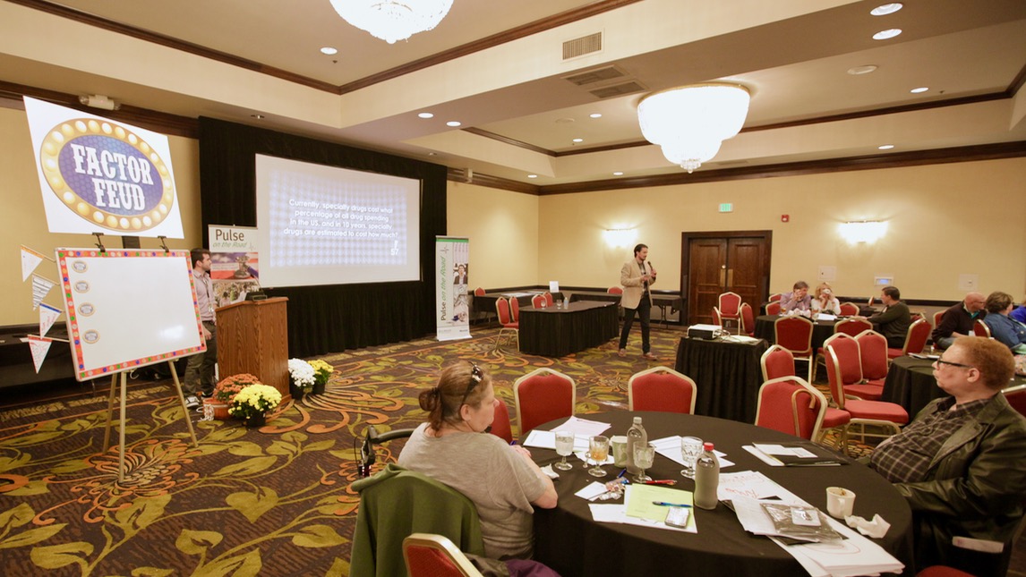 Finally, after lunch… who knew insurance could be fun? Patrick James Lynch, of Believe Limited, and his teammates Ryan Gielen and Rob Bradford, engaged the audience in “Factor Feud,” a new game that allowed teams to compete using the knowledge they just absorbed through our presentations. Modeled after the TV game show Family Feud, Patrick acted as game show host and asked the teams at their tables to recall answers to various questions gleaned from our presentations. We all had a laugh when he asked the toughest question: What were the nine counter moves Laurie listed that payers have made in the last few years? Even I had a hard time remembering what I had said!