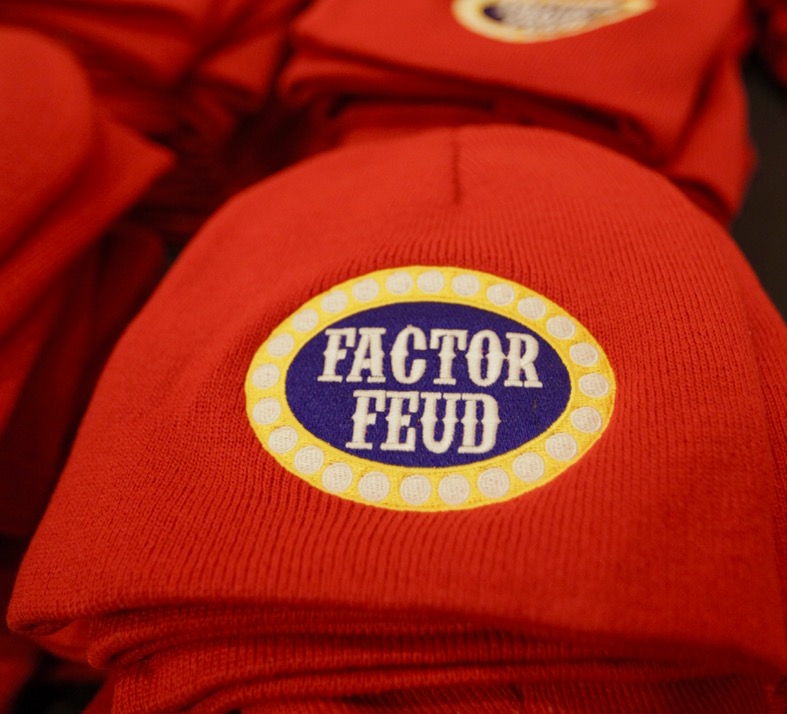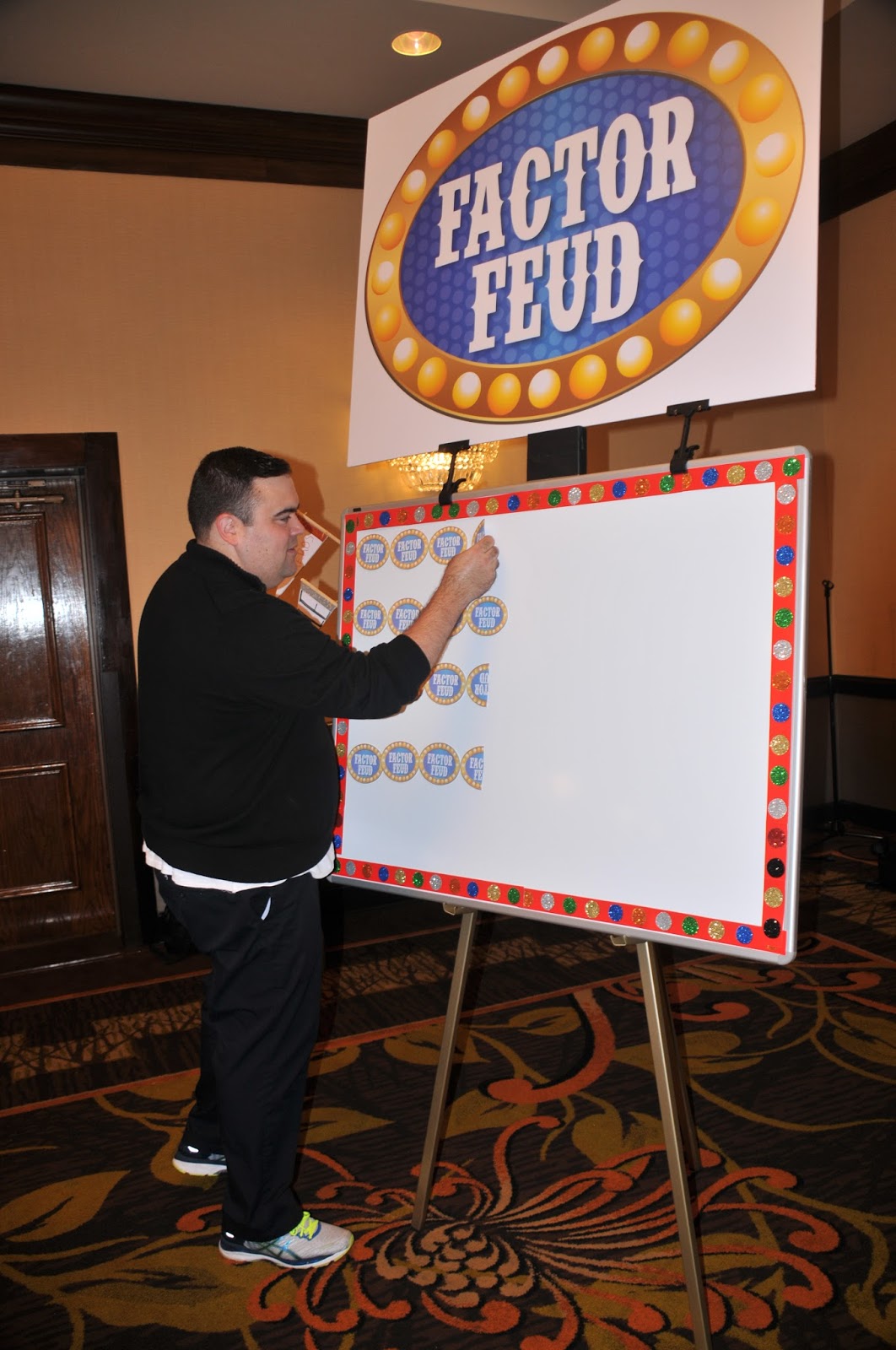 For each question Patrick charismatically posed, the teams consulted at their tables, racing against the clock. They wrote their answers on a white board, came to the front of the room—while game show music played and Rob swayed—and ta-da! Flipping their white boards over, Patrick read off the answers. The team with the right answers advanced an extra logo on the huge Factor Feud white board. Everyone got into the game immediately and loved it!