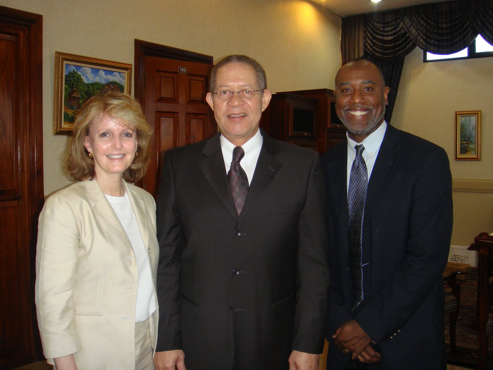 Good luck followed us on this trip as we secured a meeting this morning with the Prime Minister. This is thanks to the persistent efforts of Juliet Hanlon, a Goodwill Ambassador with World of Hope International, UN ECOSOC, who has been so helpful to both our programs, Project SHARE and Save One Life. Prime Minister Bruce Golding gave us over 20 minutes of time, remarkable considering he is a head of state and extremely busy. He asked why we had visited Jamaica and listened intently as we described hemophilia its complications and how we plan to help Jamaica. I showed him my photos of children from other developing countries, and this always has a powerful effect on people. The photos show images you just don’t see in the US—grotesquely swollen joints, amputations, gangrene, disfigurement and pain. I brought a vial of factor with me and Derek explained how much is needed as a child grows and the cost.