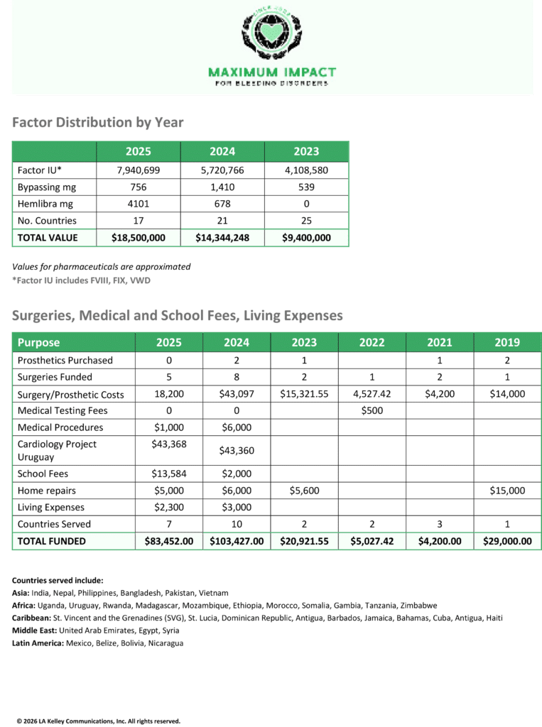 Maximum Impact assists by shipping factor directly to patients or to those who serve them: nonprofits or medical facilities. We pay the shipping and any customs fees. Founder Laurie Kelley began donating factor overseas in 1996, and started and operated Project SHARE for years before turning it over to Save One Life, Inc. Now she donates factor received from her vast network of US families, hospitals, patients and nonprofits.
