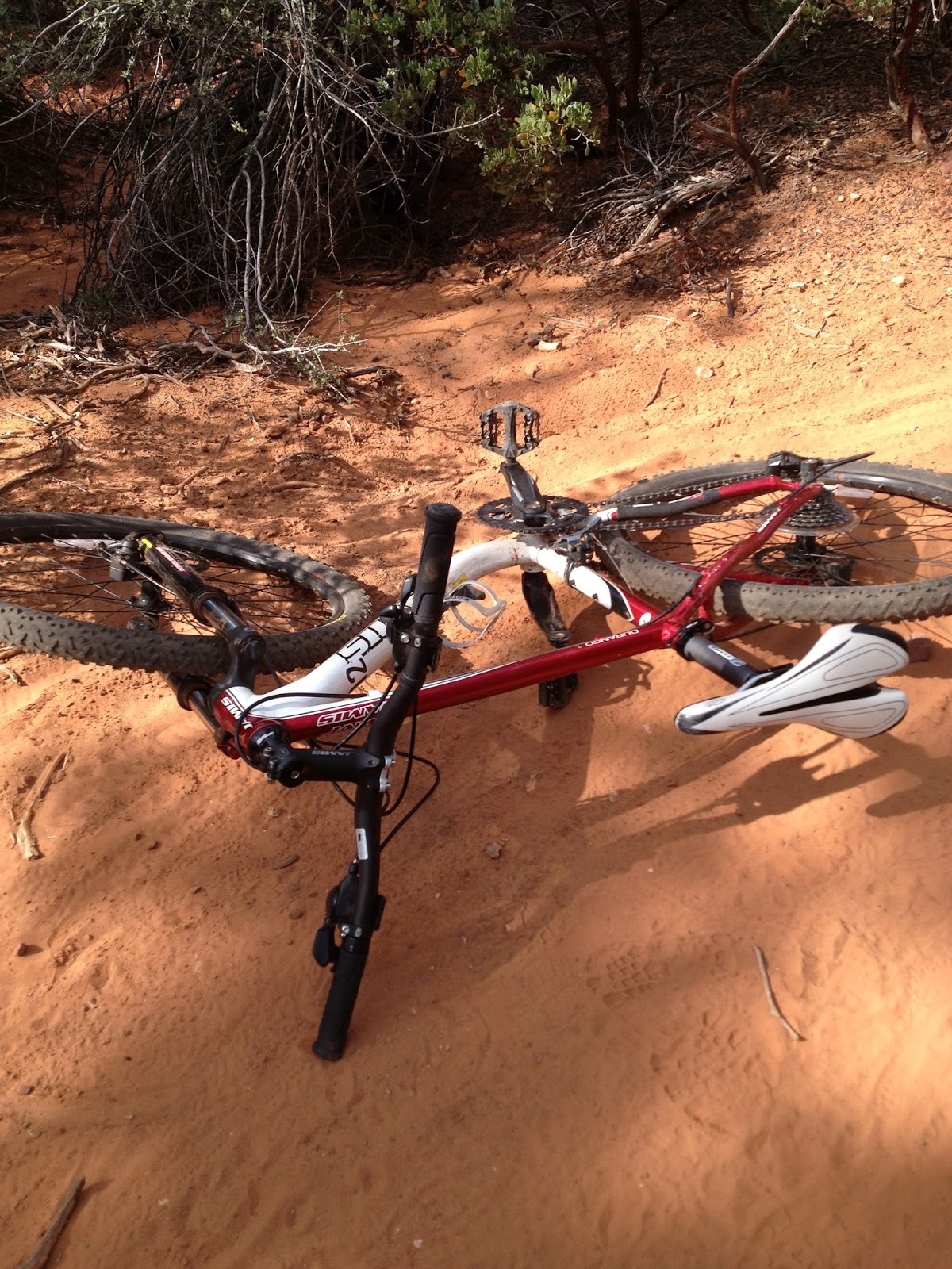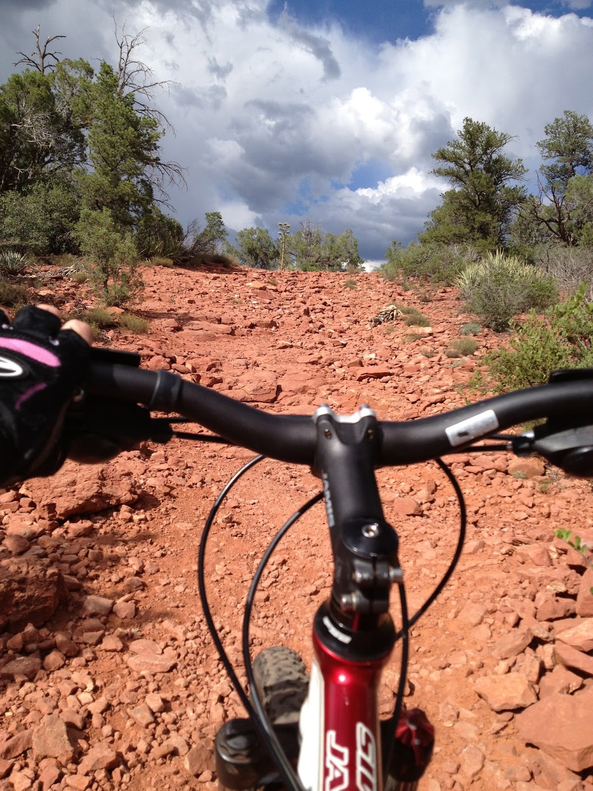 outback again to Cockscomb. I was going to nail it this time, and make George proud of me. No more walking my mountain bike. I did so much better; only had to stop twice as opposed to three or four times on Sunday. At times I felt like I was on a runaway horse, recalcitrant and skittish, as I bounced over the rocks, fishtailed in the red, fine dust, and then rolled up