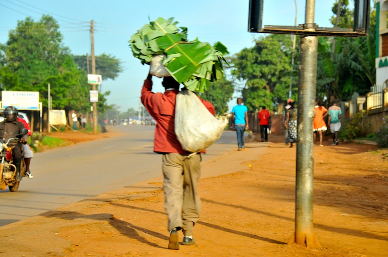 filling plastic bags with fruit. A hive of frantic activity. The bananas–called kabaragara--were