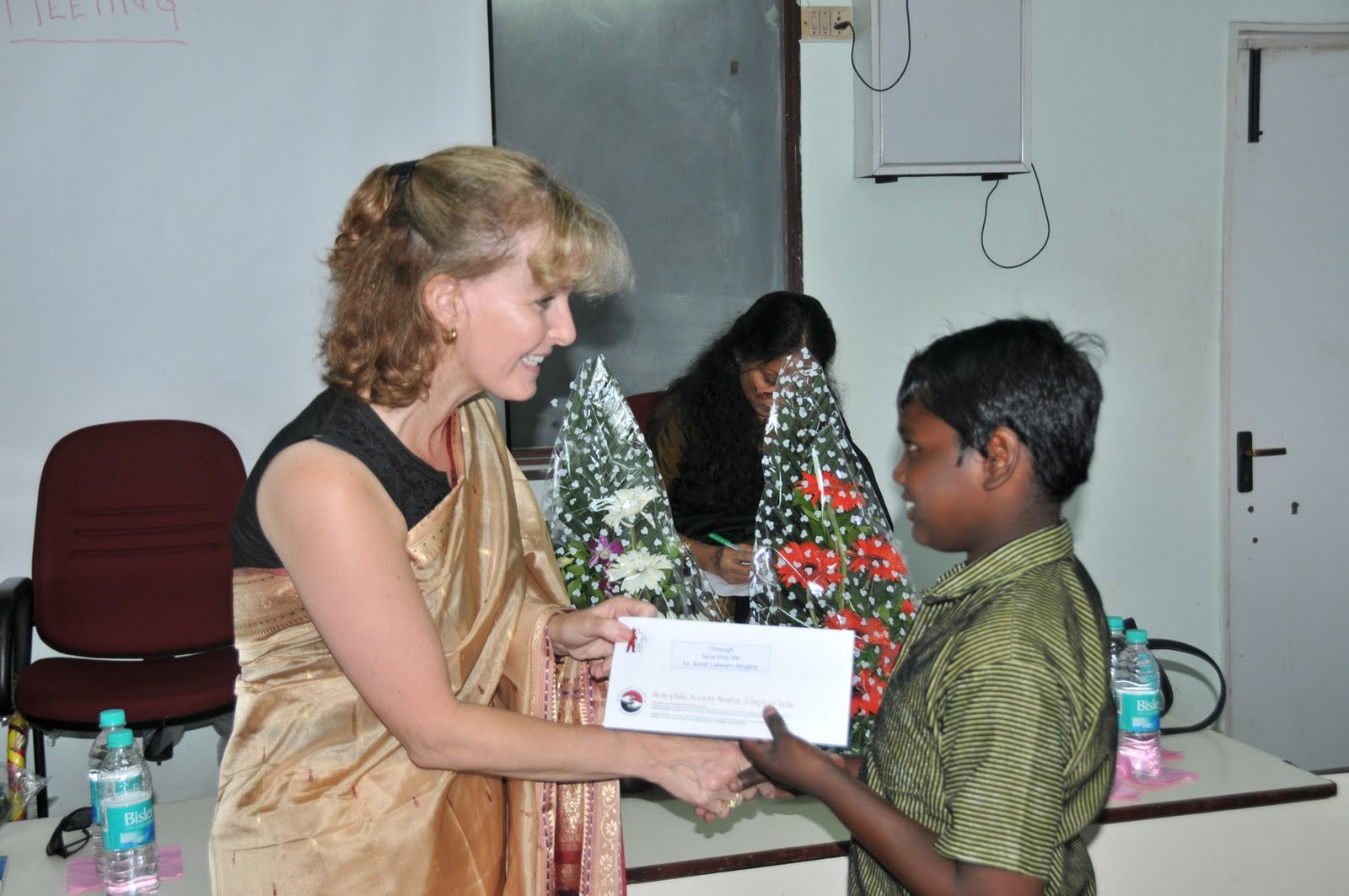 Visiting the jhodapattis (slums) on Friday night helped us to prepare for the meeting on Saturday with all the Save One Life beneficiaries. Indira Nair, president of the Mumbai Chapter, picked us up at our hotel, and we set out by “cool cab” (meaning, air-conditioned) to the King Edward Memorial (KEM) Hospital. Indira told me it’s about 15 minutes away but translated from Indian time, this meant about 45 minutes. Traffic is surreal: I feel like a lone foreign protein loose in a throbbing bloodstream of auto rickshaws, cars, trucks, taxis, motorbikes, bikes, scooters and buses that feeds the heart of this ancient city Mumbai. Everything comes slamming to within inches of sudden collision, but miraculously no one is injured. Imagine that we pay for this kind of thrill when we go on roller coaster rides!