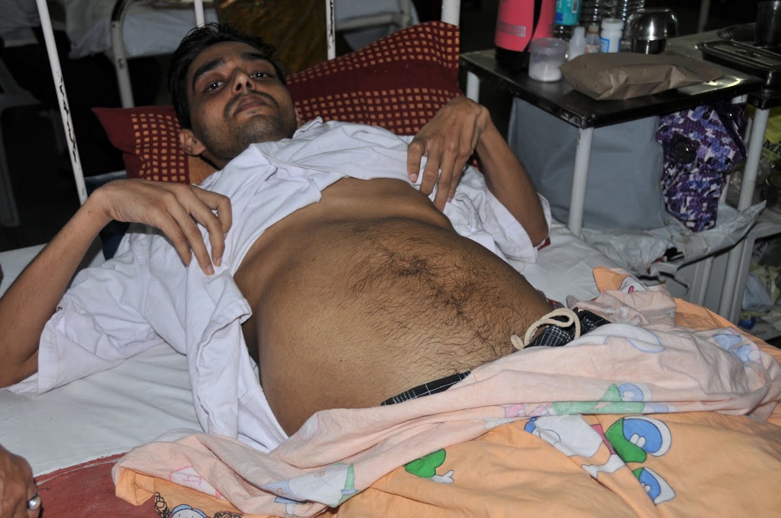 One boy has a CNS bleed, factor IX (very hard to get in India); another two boys whose grandmother kept saying the only words in English she knows, “Three… three..” Three family members who need help. She thrust their x-rays at me, pleading for help. Another man, who looked okay, till he lifted his shirt. His swollen and distended abdomen was loaded with blood, rock hard, which had become tumors, and spread so much they cracked his pelvis. The lovely man, in pain, gave me a Namaste and smiled, and allowed me to take his photo. A little boy with a urinary problem lay naked on a bed, rigged up to cryo. He smiled at me and let me hold his hand. Another with a fracture, another with a head bleed… on and on… it was quite shocking and the needs are great in just this one ward alone.