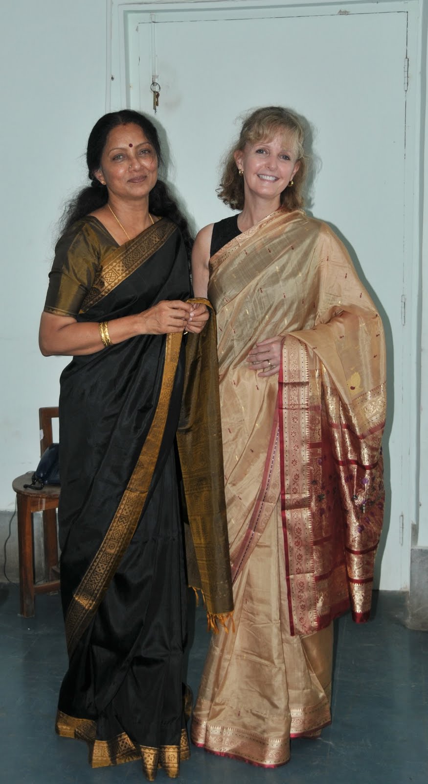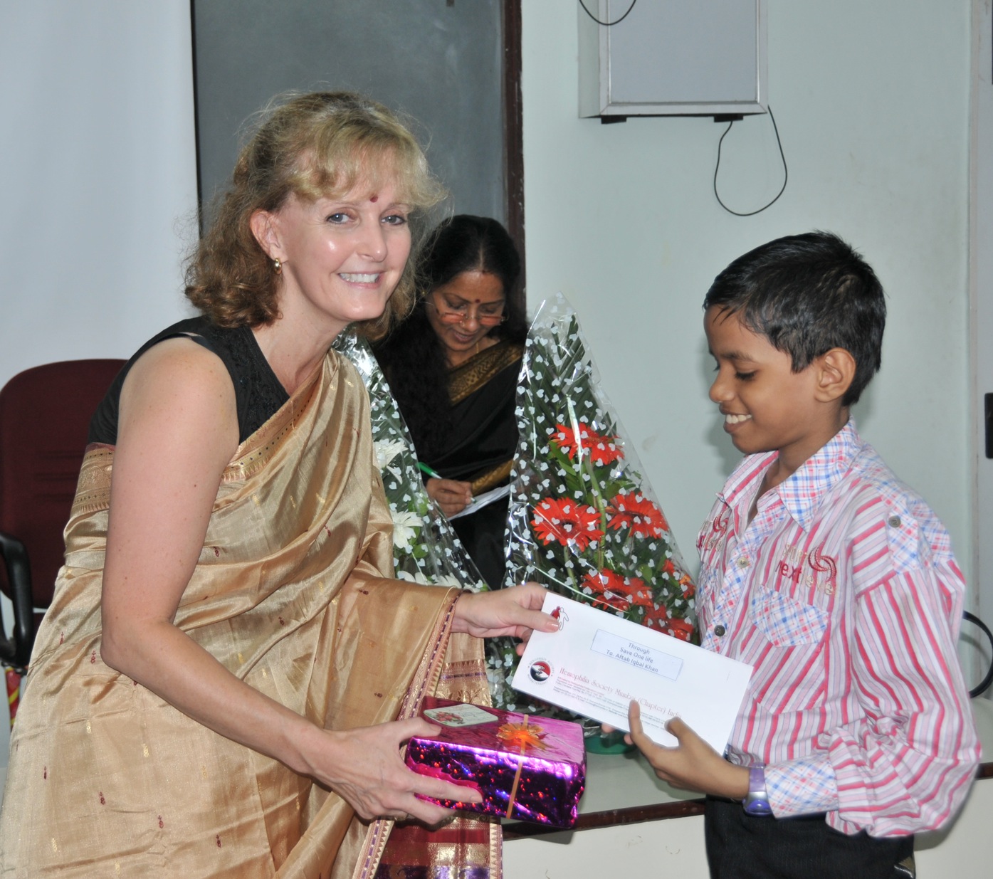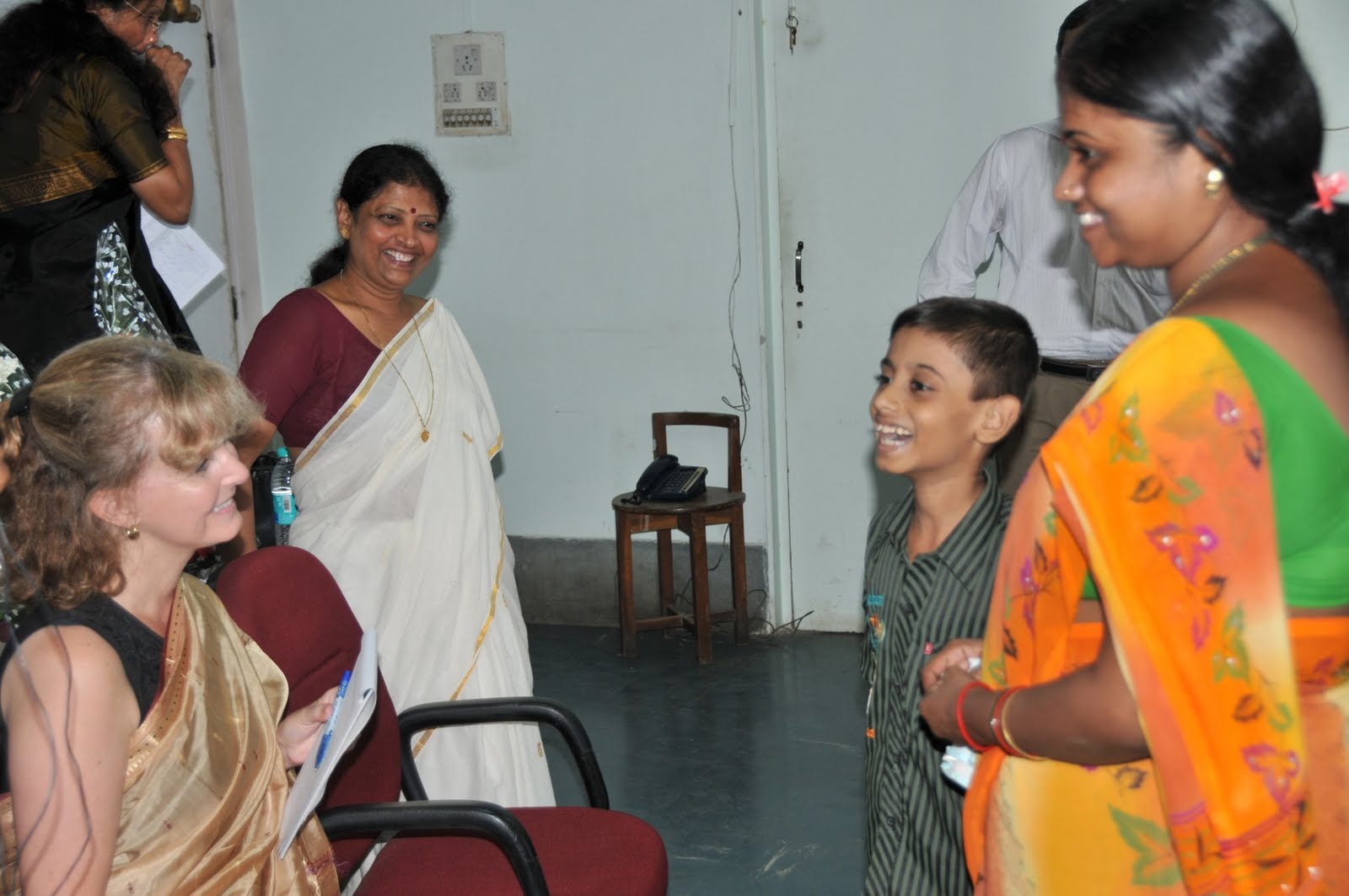 Usha and I were given beautiful bouquets of flowers, and then a big surprise for me: a sari! A bigger surprise: the families wanted to see me wear it. So I was whisked off to a deserted lab room, where I quickly changed into my first sari. Now, saris are probably the most beautiful of all female attire. Every woman, no matter her shape, looks elegant in one. It is made to flatter the female form. However, it takes skill in wearing one so it doesn’t end up around your ankles! Mercifully, my colleagues pinned it to me everywhere so I felt rather propped up. When I re-entered the presentation room, the families exploded into applause, and I appropriately “modeled” it for them. Moments like these erase all differences in who we are. I was reminded of the last words of the classic American book I read on the plane ride over, To Kill a Mockingbird, after Scout says of Tom Robinson, “…he was real nice….” and Atticus replies, “Most people are, Scout, when you finally see them.” Despite our obvious differences in religion, nationality and socioeconomic status, we all can relate to certain basic human experiences—humor and celebration are some of these we all share.
