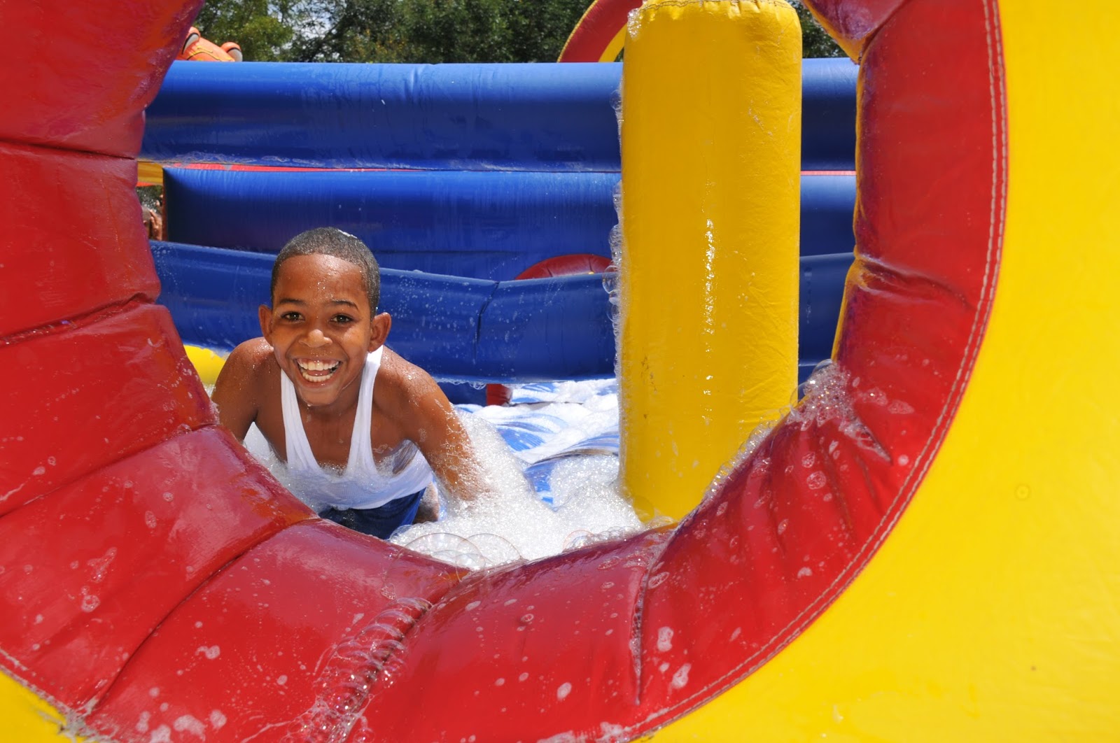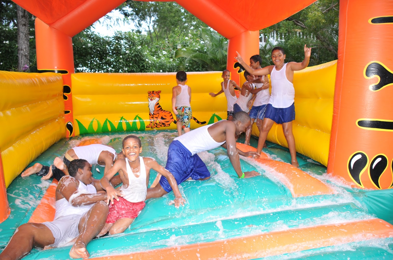 One big surprise came when the kids were assembled outside the compound, eventually allowed back in through a series of “obstacles” as a group, with each obstacle an educational game about hemophilia at a table, staffed by maybe Dr. Rosa, their pediatric hematologist, or Dr. Joanne, the adult hematologist. When they passed through all the obstacles, they entered the main lawn of the compound, where there was a carnival! The center of attention was a huge, inflated slide which could and did hold up to 20 boys at one time, sliding, diving through tubes, climbing over inflated bars and then emerging at the end through two holes. No one seemed to notice when the clouds opened up and poured rain on everyone for about 20 minutes. Everyone beamed sunshine from within.