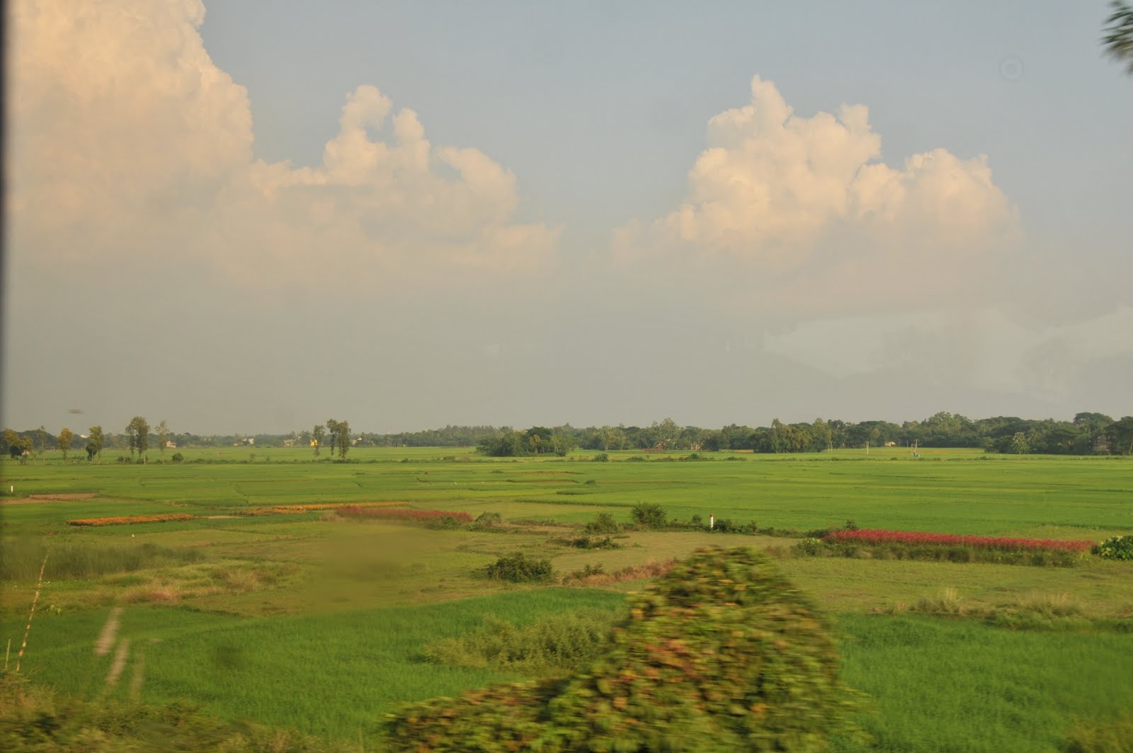The train took us through so many rural villages. The scenery leaving Calcutta was one of terrible charcoal-grey slums alongside the tracks, but eventually gave birth to lush rice paddies, palms, red dirt roads, where water buffalo graze and villagers in colorful saris walk with umbrellas to protect from the sun. The sun set on the beautiful India countryside.