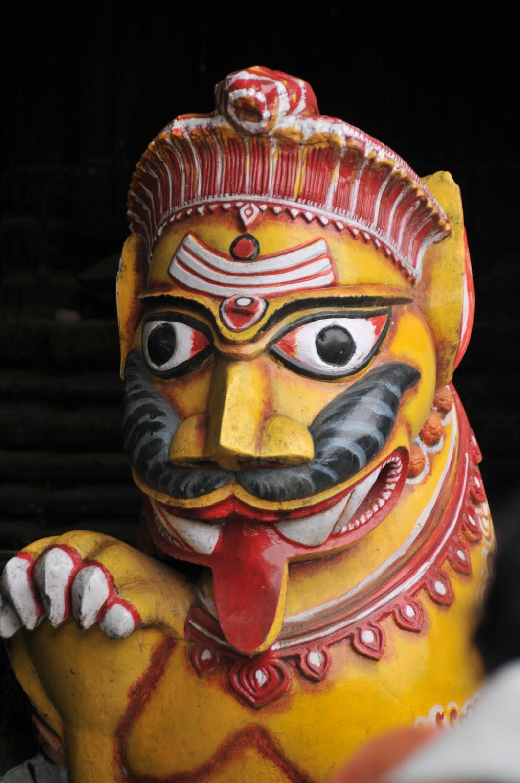 Exiting, I was surprised by an enormous pewter-colored elephant, ornamentally painted and sporting an ankle bracelet, just outside the temple door. When you offer it a coin, it snatches it then touches your head in blessing. Not having any rupees, I think I gave it a New York City transit coin.
