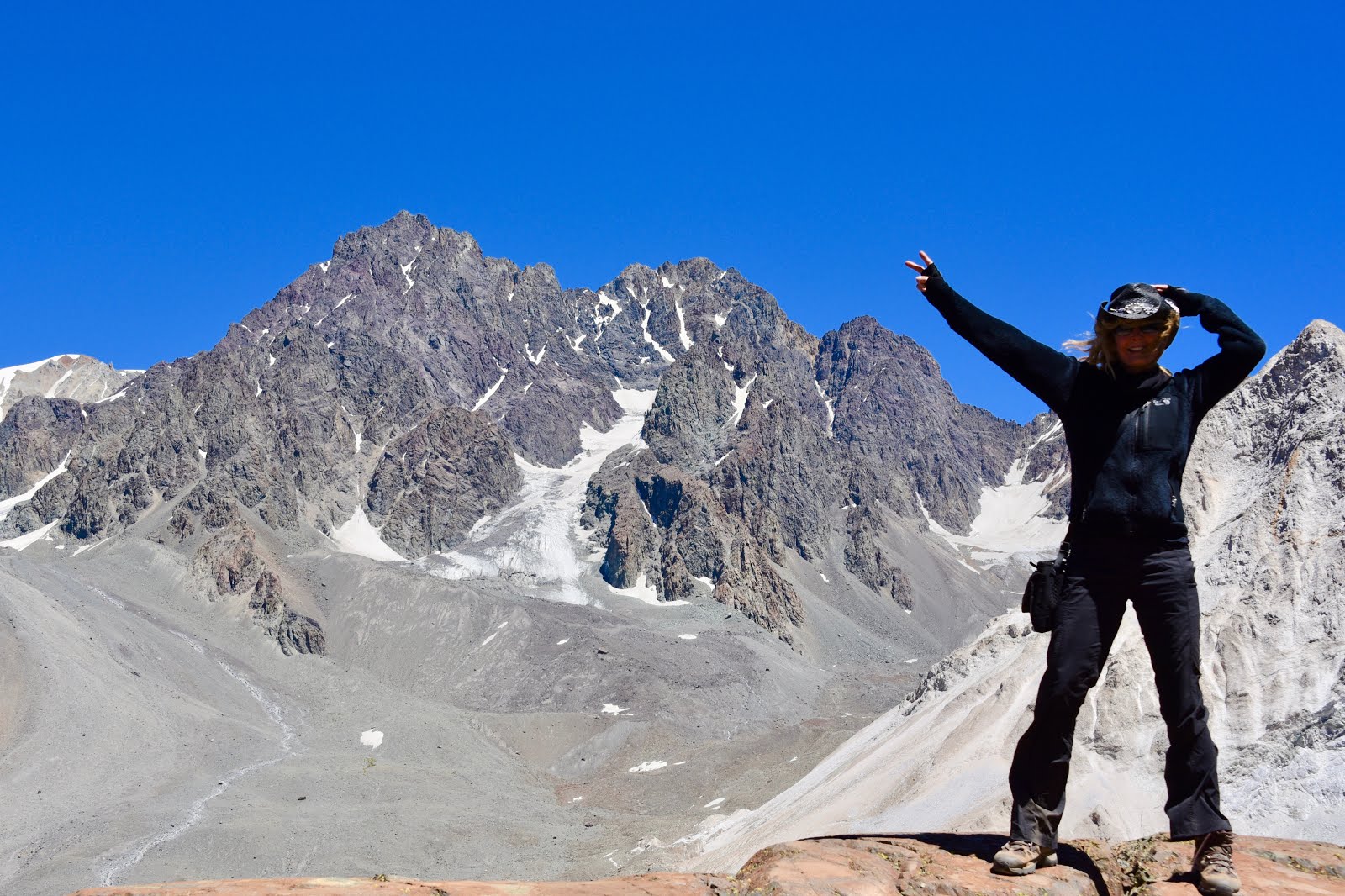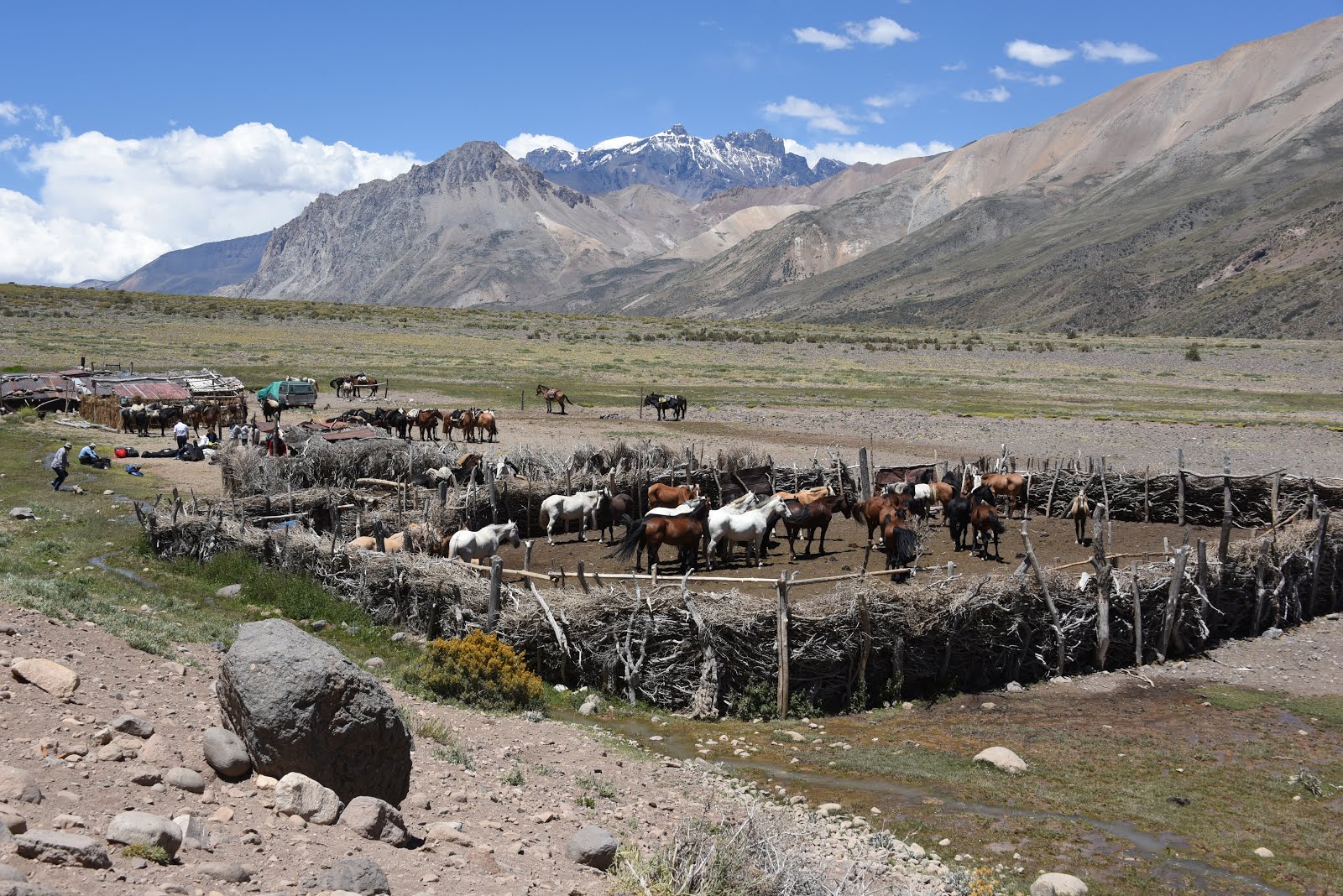 flatland that threatened to permanently remove my cowboy hat, then up winding dirt paths into the mountains. We crossed several rushing rivers that swept the accompanying, yelping dogs downstream and soaked our hiking boots. We made camp that evening in a beautiful little valley, where the majestic Andes towered all about us. We also had a small team with us to cook, handle the horses, and help out with packing.