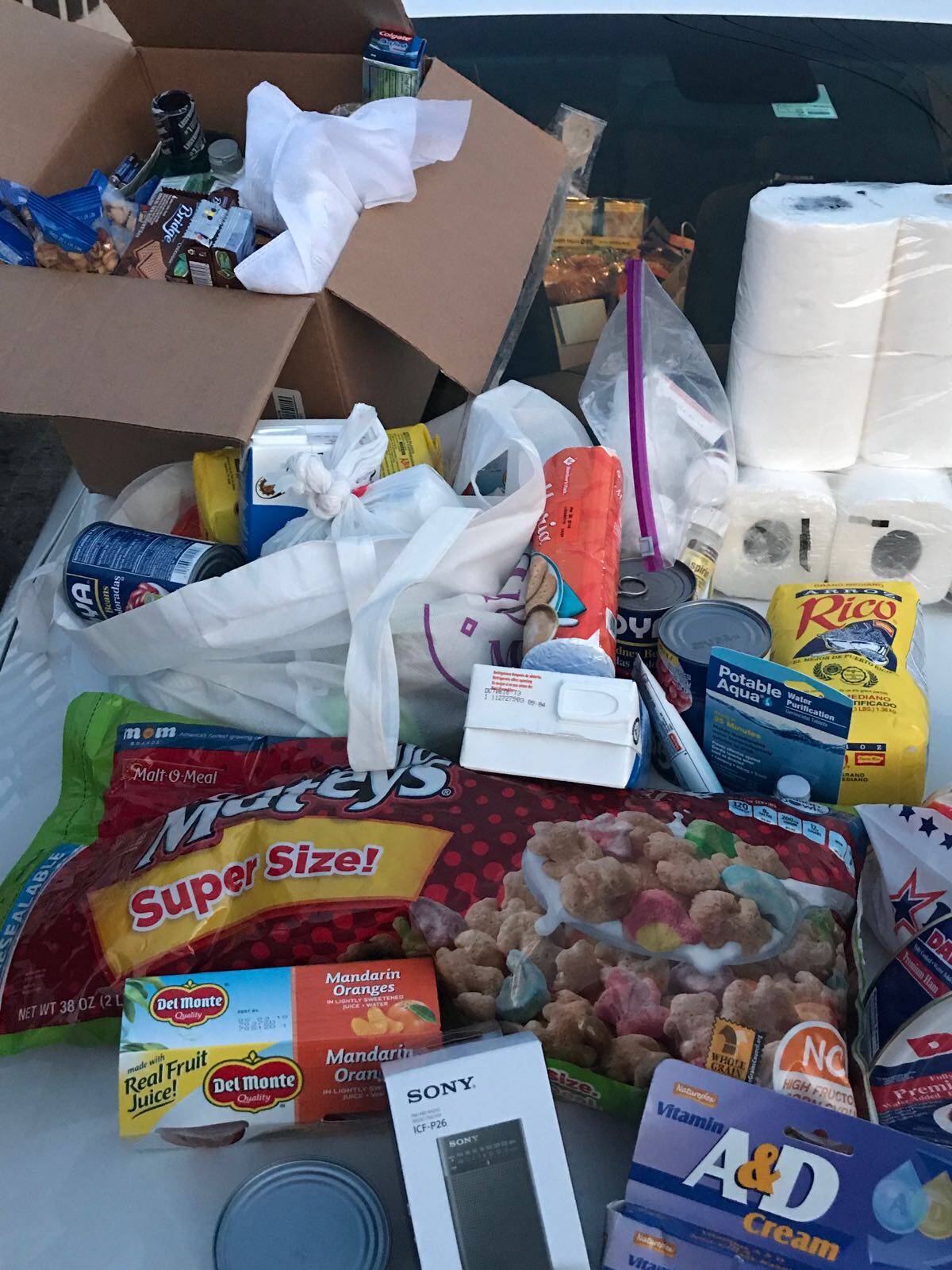 batteries, clothing, toiletries, cash assistance for household bills, aqua tablets,
