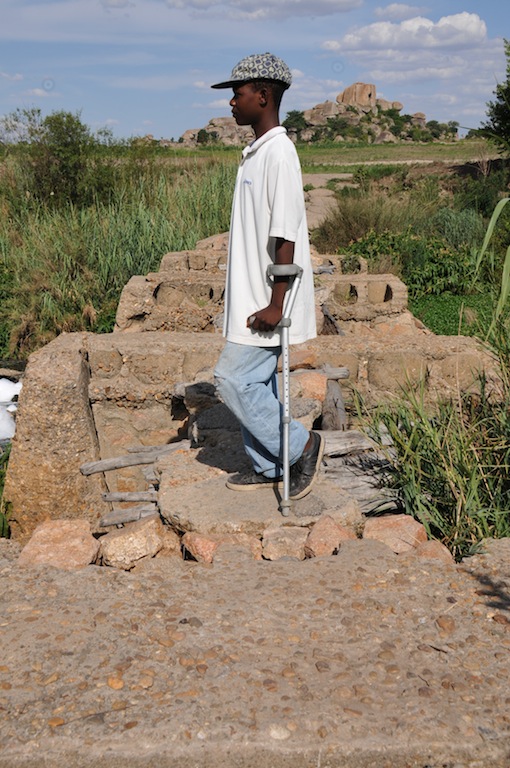 What does he do when he has a bleed? He must hobble to his sister’s place, four kilometers away. As if that wasn’t bad enough, he must cross a footbridge. The bridge is in ghastly disrepair. Originally the land was owned by a white farmer, as much of the land in “Rhodesia” used to be. Independence came for black Zimbabwe in 1980, when Mugabe came to power. In 2001, during the very week I was there, Mugabe decided that there would be land “reform.” Black citizens could now reclaim their lands from white farmers, even those who had legally held family farms for 100 years and had provided the agricultural revenue that earned Zimbabwe “the breadbasket of Africa.” The guy who owned this land I stood on was one of them, and he was not happy. Before he abandoned his land to the black citizens who came to claim it, he left a little present behind. He bombed the stone footbridge. George now has to navigate this treacherous passing each time he has a bleed.